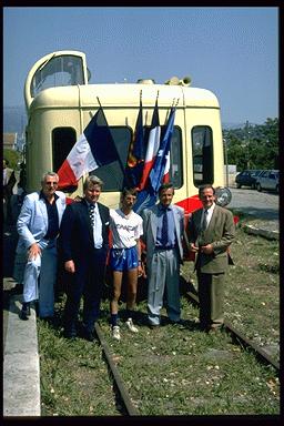 Le 6 juin 1993, Messieurs Michel Mouillot (à l'époque Maire de Cannes, Vice-Président du Conseil Régional), André Aschiéri (actuel Maire de Mouans-Sartoux) et Jean-Pierre Leleux (actuel Maire de Grasse, Vice-Président du Conseil Général des Alpes Maritimes). Belle photographie de famille devant le train, mais que font-ils réellement pour le faire circuler ? (photo J-Paul Lescat)